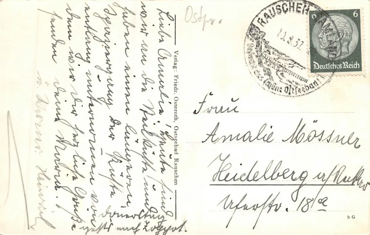Rückseite: gelaufen 1937 von Rauschen (Samland)