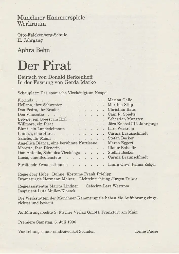 Otto-Falckenberg-Schule, Hermann Malzer: Programmheft Aphra Behn: DER PIRAT. Premiere 6. Juli 1996 Münchner Kammerspiele Werkraum.