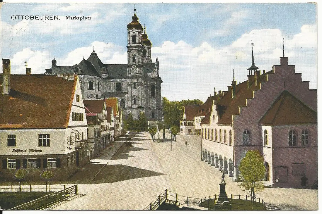 Ottobeuren, Marktplatz m. Gasthaus Mohren, 1929 gebr. Farb AK.