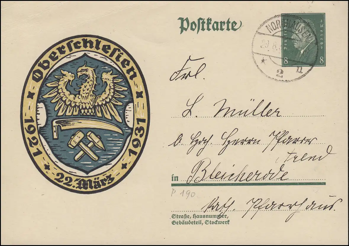 P 190 Volksabstimmung in Oberschlesien NORDHAUSEN 2 - 29.8.1931 nach Bleicherode