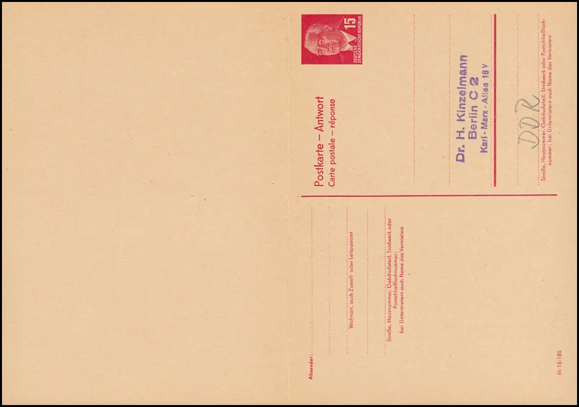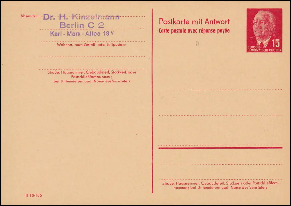 P 65aII Wilhelm Pieck 15/15 Pf Doppelkarte DV III-18-185, ungebraucht