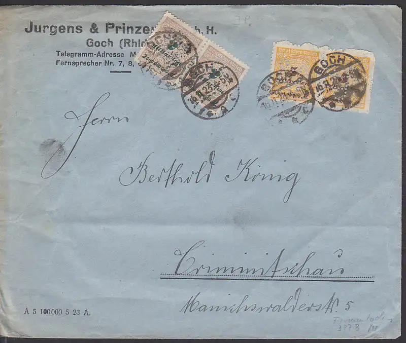 PERFIN / PERFORES - " JP." Goch (Rhld) 16.11.23, Inflafrankatur, dabei 327B Firmenlochung