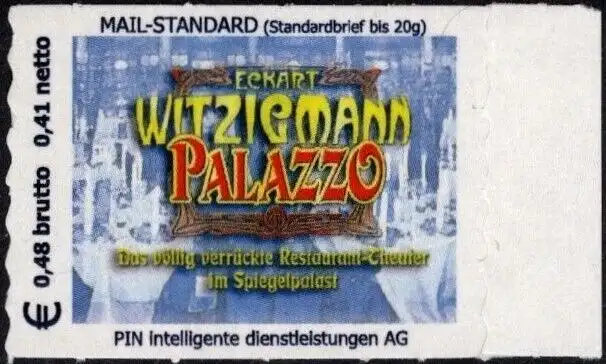 • MichSeite PIN AG: MiNr. 32, 12.01.2004, "Witzigmann Palazzo", Wert zu 0,48 EUR, postfrisch Beschreibung \nPostdienstleister: PIN AG, Berlin \nAusgabeanlass: Briefmarkenausgabe "Witzigmann Palazzo" Katalognummer: MiNr. 32 Ausgabedatum: 12.01.2004 Nominale: Wert zu 0,48 EUR \nTyp: - \nErhaltung: Randstück, selbstklebend, wellenartig und gerade gestanzt, postfrisch \nHinweis: - Thema: Theater, Kunst, Musik, Restaurant, Potsdamer Platz, Spiegelpalast