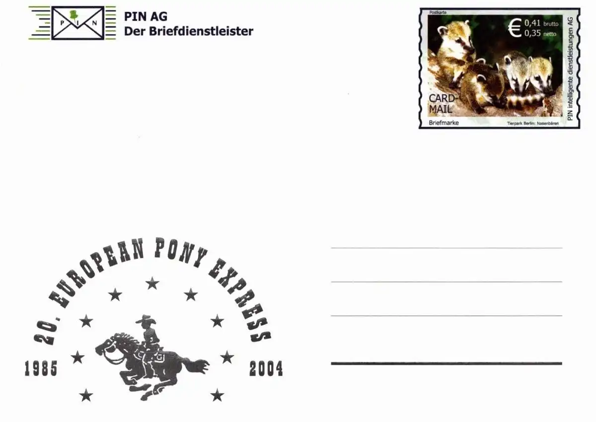 • MichSeite PIN AG: MiNr. KB 5, 19.08.2004, "European Pony Express", Ganzsache (Postkarte), ungebraucht Beschreibung \nPostdienstleister: PIN AG, Berlin \nAusgabeanlass: Ganzsachenausgabe "European Pony Express" Katalognummer: MiNr. KB 5 Ausgabedatum: 19.08.2004 Nominale: Satz (1 Ganzsache) zu 0,41 EUR \nTyp: - \nErhaltung: ungeraucht \nHinweis: - Thema: Pferde, Reiten, Postbeförderung