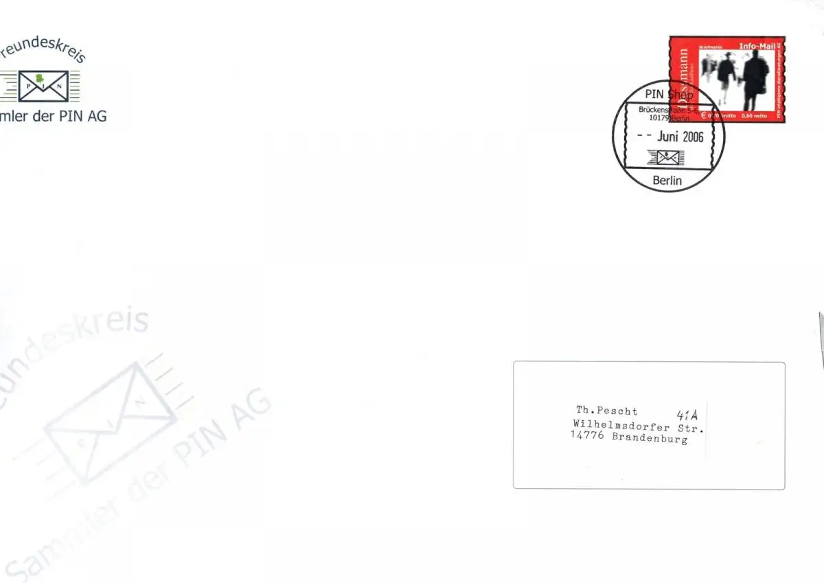 • MichSeite PIN AG: MiNr. P 13, 00.06.2006, "Dussmann, das Kultur-Kaufhaus", Wert zu 0,70, Ganzsache, echt gelaufen (3) Beschreibung \nPostdienstleister: PIN AG, Berlin \nAusgabeanlass: Ganzsachenausgabe "Dussmann, das Kultur-Kaufhaus" Katalognummer: MiNr. P 13 Ausgabedatum: 00.06.2006 Nominale: Satz (1 Wert) zu 0,70 EUR \nTyp: - \nErhaltung: Ganzsache (Umschlag), echt gelaufen (3) \nHinweis: Ausgabe des "Freundeskreis Sammler der PIN AG", Abbildung zeigt nicht den kompletten Umschlag