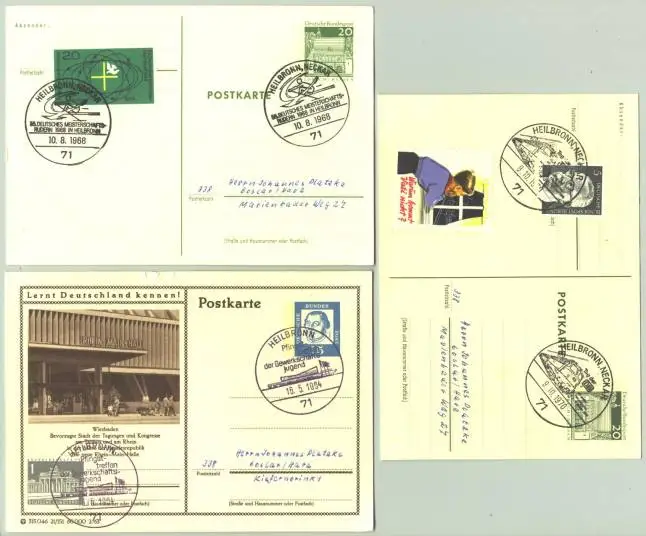 PK 3 x Heilbronn ab 1964 (intern : 1020617) Artikelbeschreibung u. Zustand : Siehe Scan / Gebrauchsspuren. Weitere Infos : 3 x Postkarten / Ganzsachen mit huebschen Sonderstempeln von Heilbronn 1964, 1968, 1970. PLZ-Bereich pauschal 74072