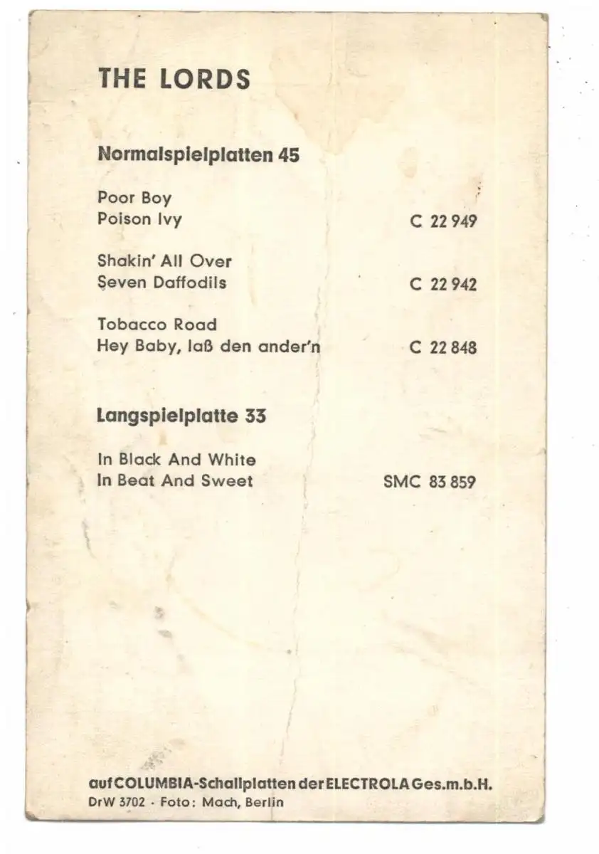 POP - MUSIK, "THE LORDS" mit allen Unterschriften, leichter Mittelknick