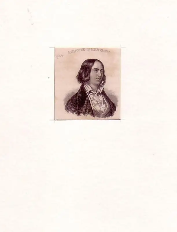 Miniatur-Porträt. - George Sand (eigtl. Amandine-Aurore-Lucile Dudevant, geb. Dupin de Francueil), verfaßte neben Romanen auch zahlreiche sozialkritische Beiträge, in denen sie die Emanzipation der Frauen einforderte. 1838-1847 lebte sie mit ihren Kindern mit Frédéric Chopin zusammen, von November 1838 bis ins Frühjahr 1839 auf Mallorca ("Un Hiver à Majorque"). - Leicht gebräunt