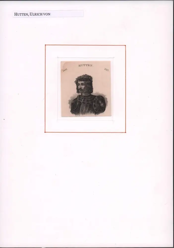Miniatur-Porträt. - Der Humanist von Hutten (1488 Burg Steckelberg - 1523 Ufenau, deutscher Publizist, Politiker, Reichsritter), setzte sich für eine moralische Kirchenreform u. ein nationales Reich statt der Territorial-Fürstentümer ein. Seine Devise lautete "Ich hab's gewagt". - Leicht gebräunt