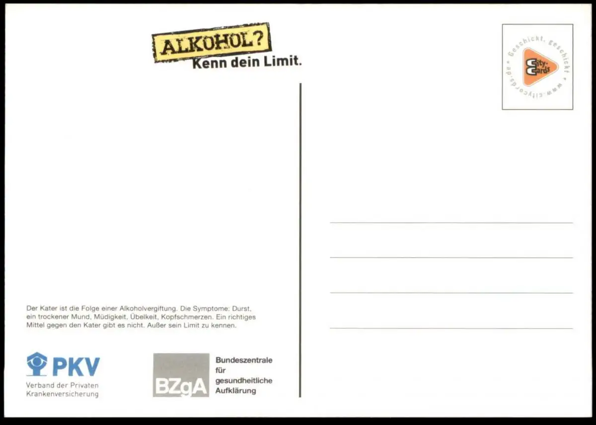 POSTKARTE DAS LETZTE BIER WAR SCHLECHT. MEINT MEIN KATER. ALKOHOL? KENN DEIN LIMIT. UMRANDUNG SCHWARZ