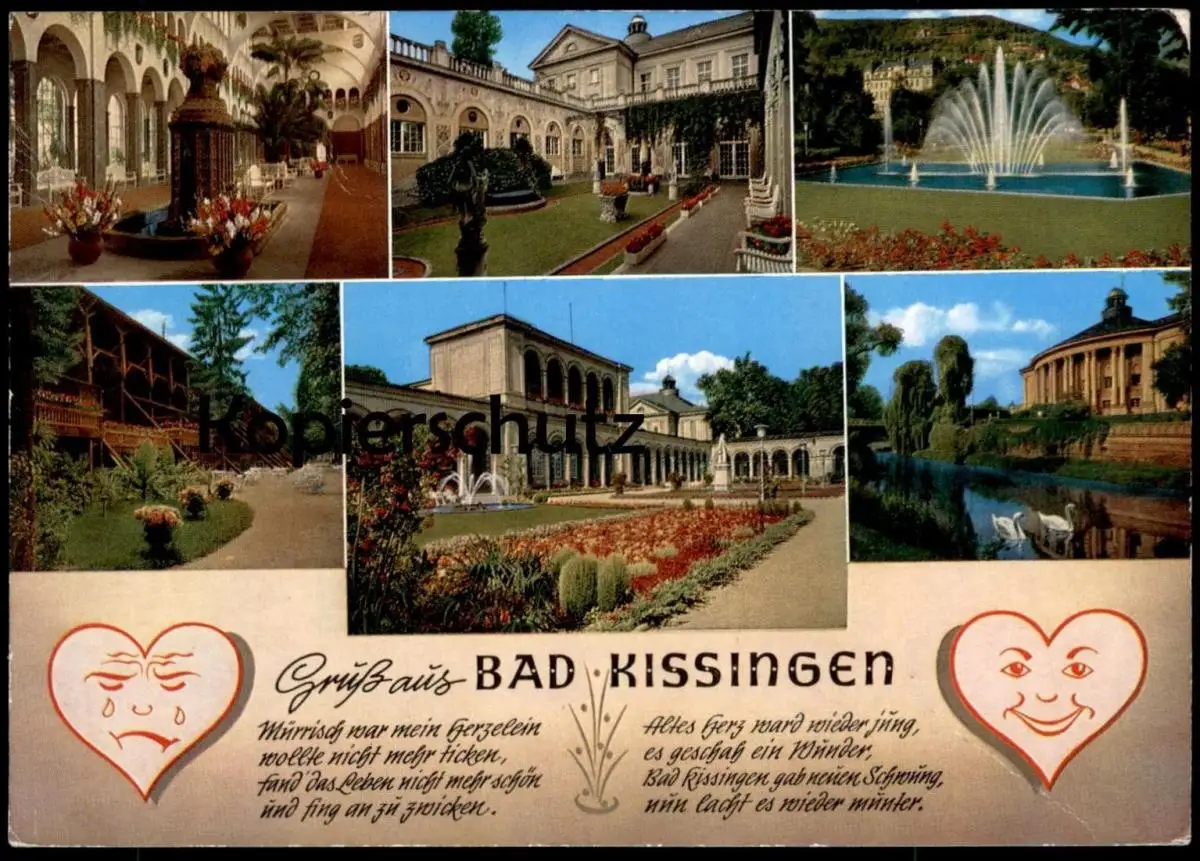 ÄLTERE POSTKARTE GRUSS AUS BAD KISSINGEN MÜRRISCH WAR MEIN HERZELEIN WOLLTE NICHT MEHR TICKEN, FAND DAS LEBEN NICHT MEHR SCHÖN UND FING AN ZU ZWICKEN. ALTES HERZ WARD WIEDER JUNG, ES GESCHAH EIN WUNDER, BAD KISSINGEN GAB NEUEN SCHWUNG NUN LACHT ES WIEDER MUNTER... WEINENDES & LACHENDES HERZVerlag: Oberfränkischer Ansichtskartenverlag, Bayreuth