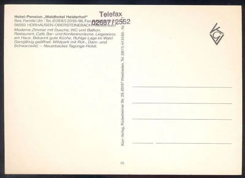 ÄLTERE POSTKARTE HOTEL PENSION WALDHOTEL HEIDERHOF BESITZER FAMILIE UHL HORHAUSEN-OBERSTEINEBACH ALTENKIRCHEN FLAMMERSFELDVerlag: Korr, Wiesbaden