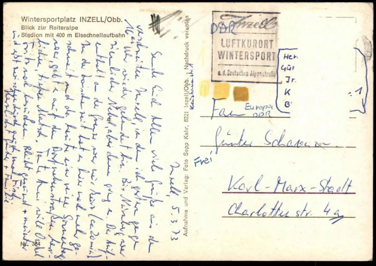 Gelaufen: 05.03.1973 mit Stempel Inzell nach Karl-Marx-Stadt, Briefmarke entfernt Erhaltung (s. Scan): mittel, linke untere Ecke minimal bestoßen / 917167