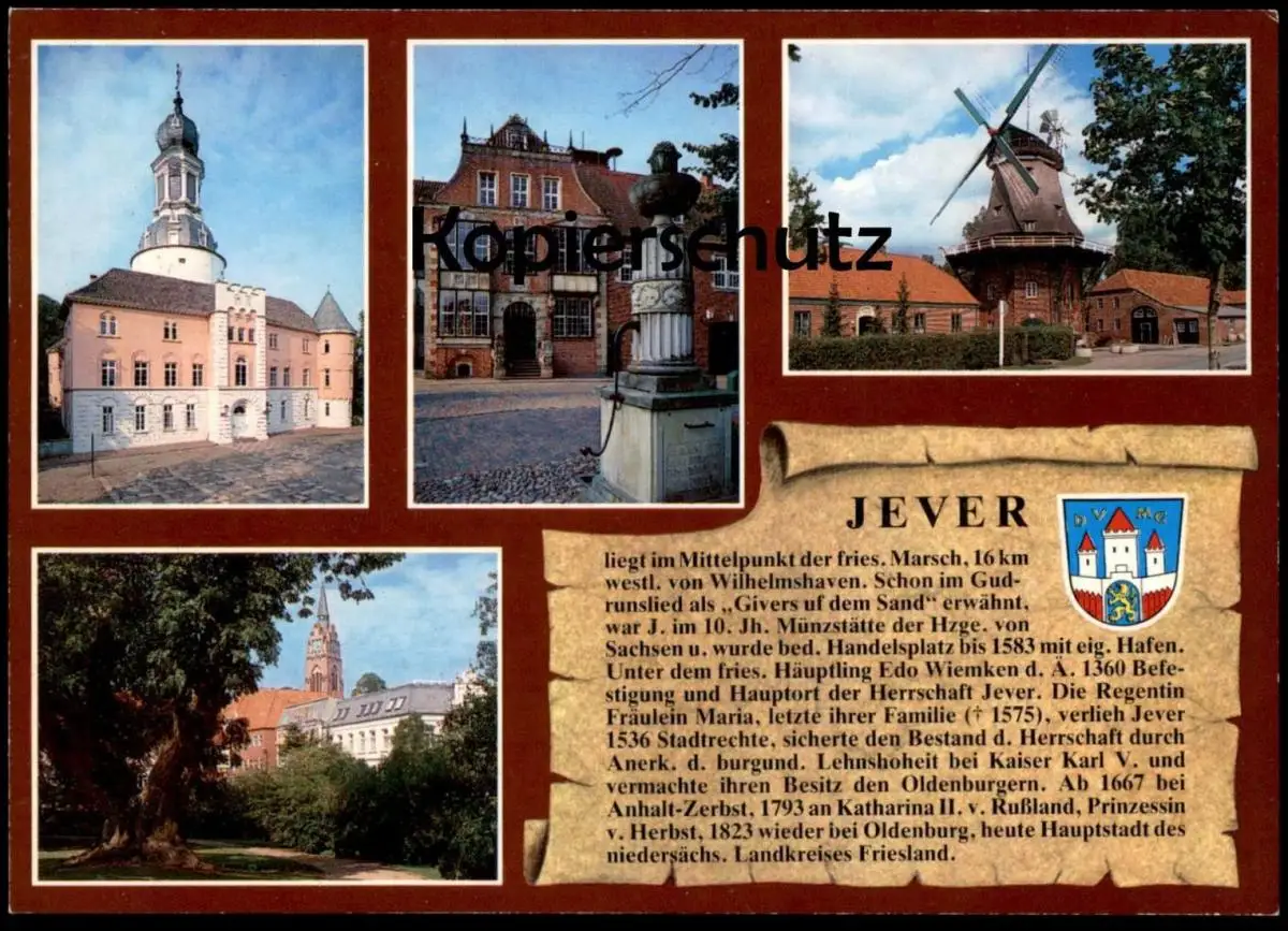 POSTKARTE JEVER MIT WAPPEN & GESCHICHTE CHRONIK Chronikkarte chronique chronicle storycard Mühle Windmill Molen Mill