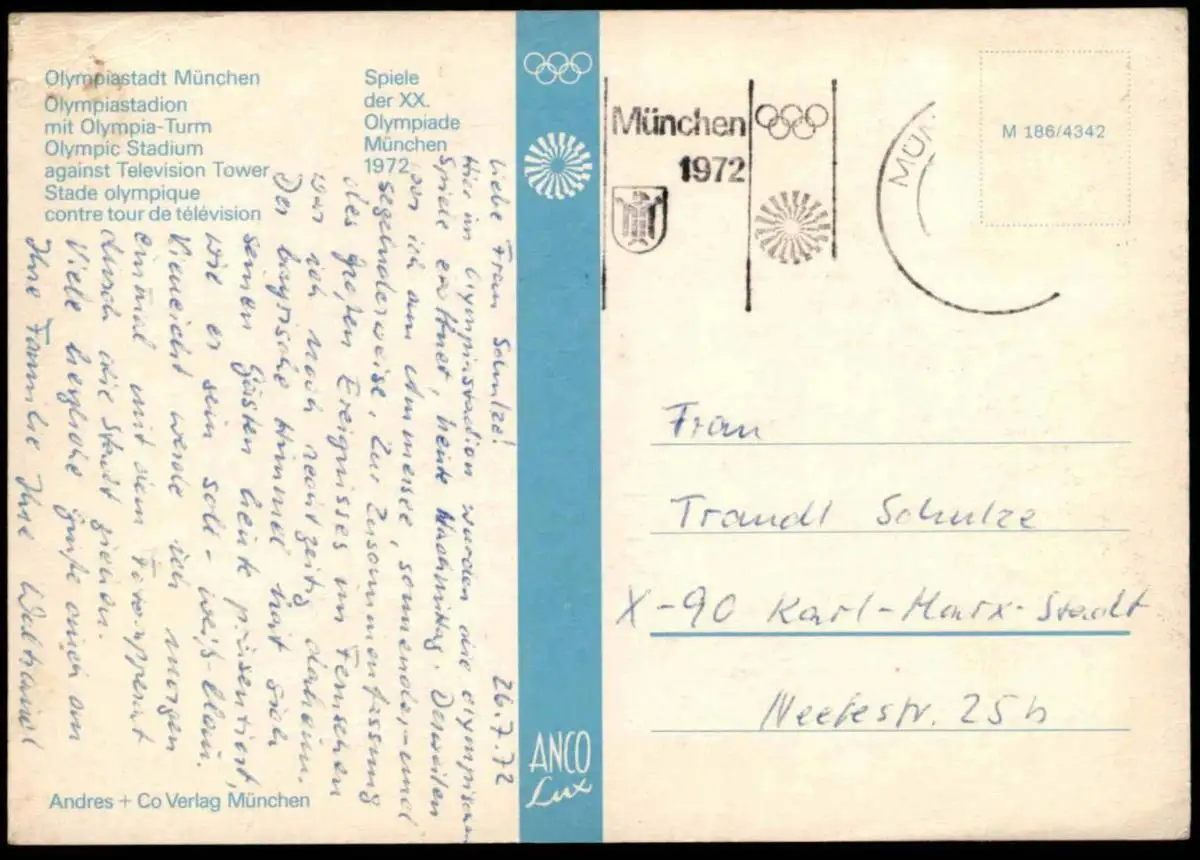 Gelaufen: xx.xx.1972 (Verfasserin schreibt irrtümlich Datum 26.07. als Eröffnungstag der olympischen Spiele) nach Karl-Marx-Stadt, Briefmarke (sauber) abgelöst