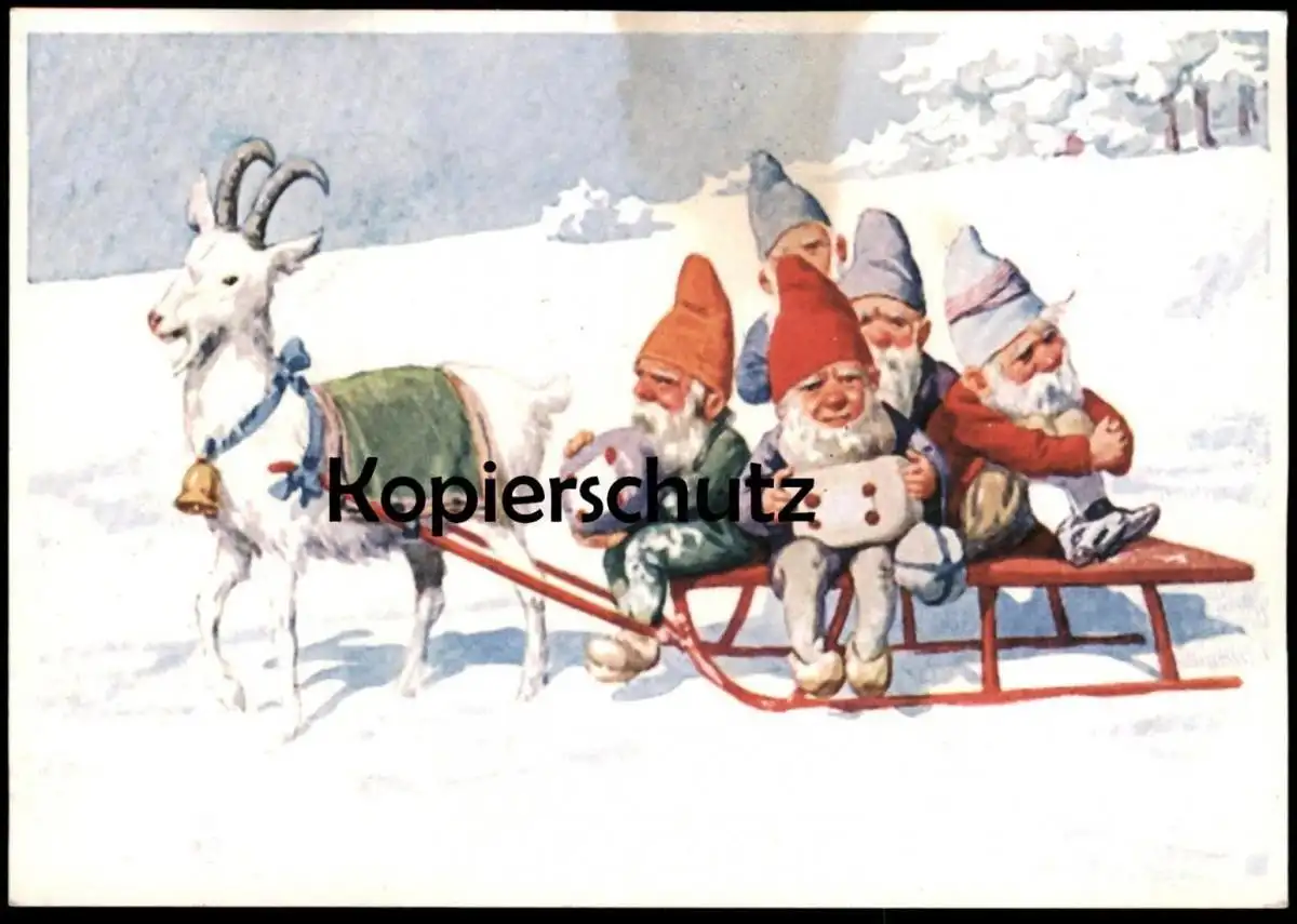 ALTE POSTKARTE ZWERGE AUF SCHLITTEN VON ZIEGE GEZOGEN WEIHNACHTEN ZWERG GLOCKE HAUS HÜLSHOFF DER ZIEGENHOF TECKLENBURG