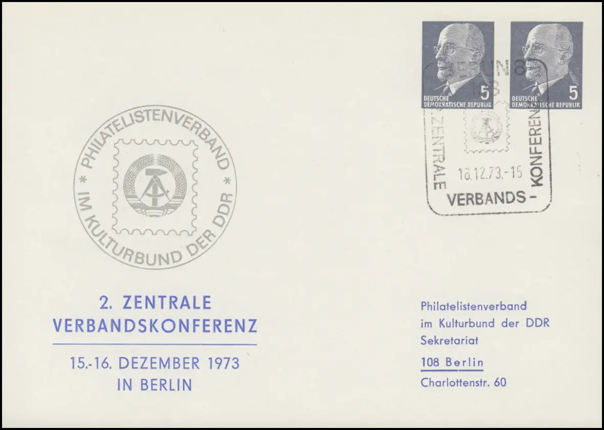 2. Zentrale Verbandskonferenz Philatelistenverband im Kulturbund der DDR Berlin 1973, gedruckte Anschrift in 5 Zeilen, Sonderstempel BERLIN 1973