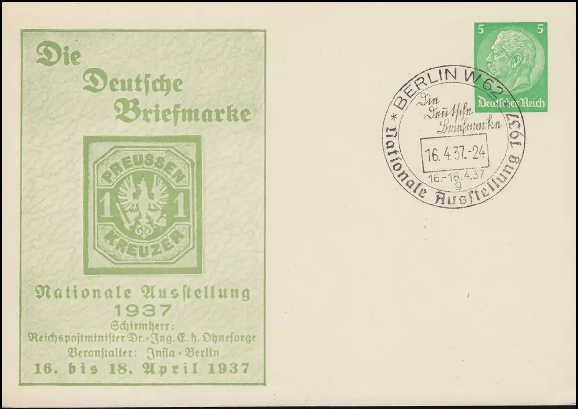 Privatpostkarte Hindenburg 5 Pfennig mit passendem Sonderstempel: Die Deutsche Briefmarke / Nationale Ausstellung Berlin 1937 / Abbildung: MICHEL Preußen 1 Kreuzer - Farbe Grün