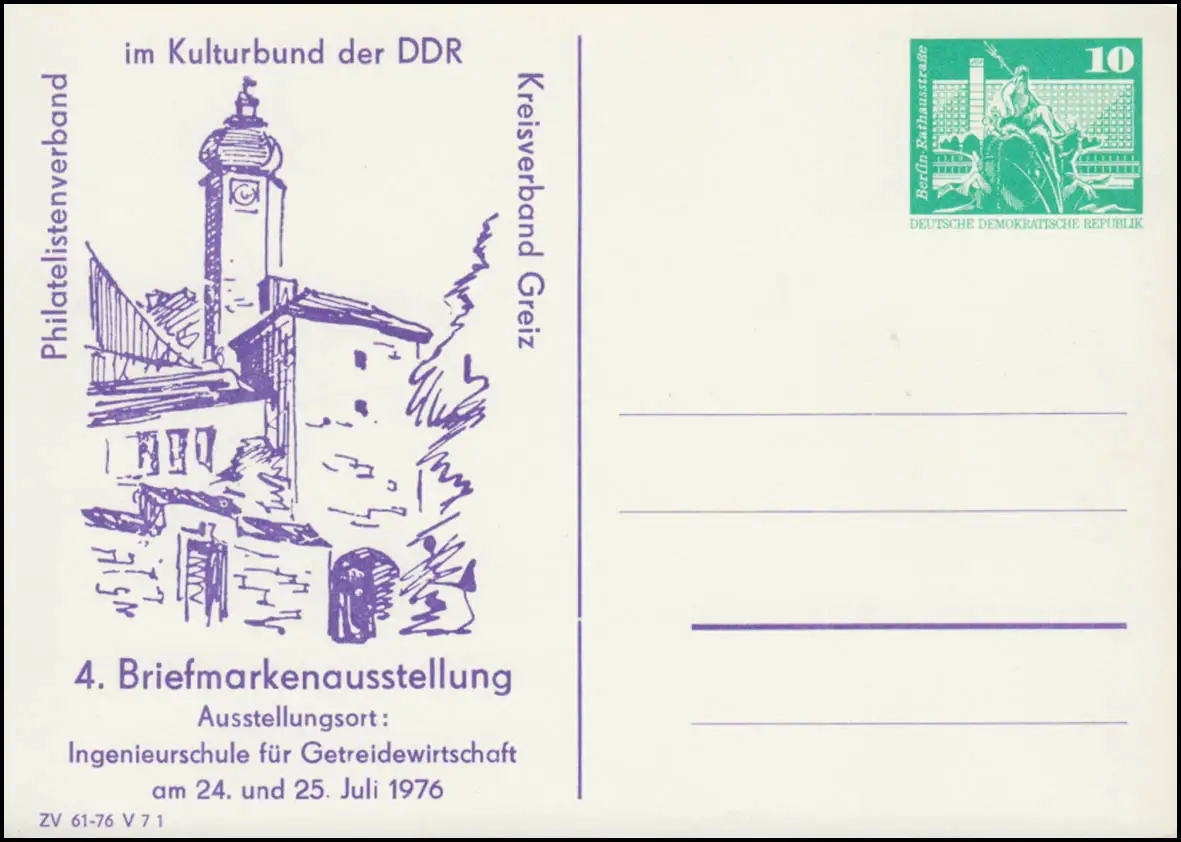 4. Briefmarkenausstellung in der Ingenieurschule für Getreidewirtschaft Juli 1976 im Greiz
