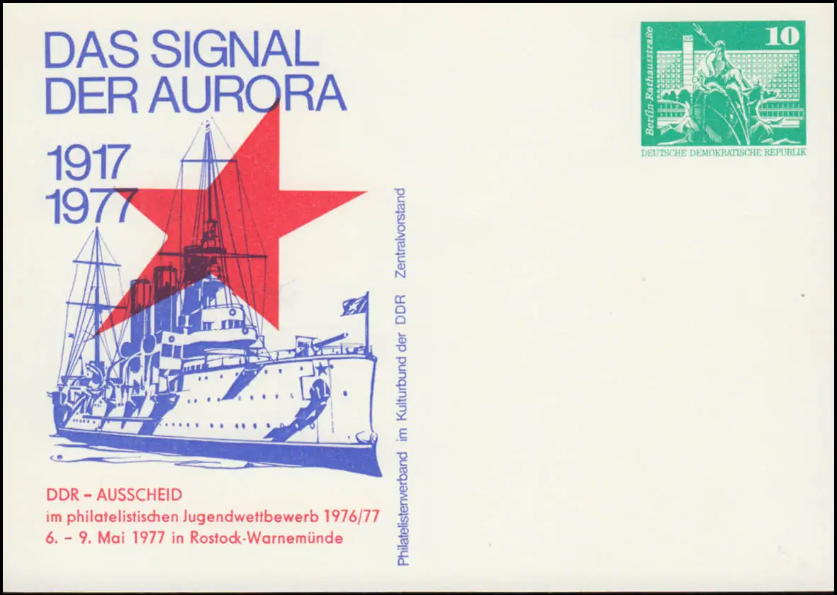 Das Signal der Aurora 1917-1977 / DDR-AUSSCHEID im philatelistischen Jugendwettbewerb 1976-1977 in Rostocl-Warnemünde / Abbildung: Panzerkreuzer "Aurora" und Roter Stern
