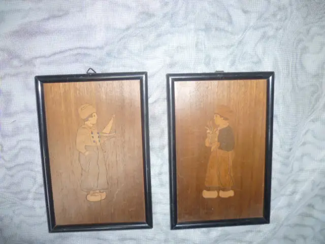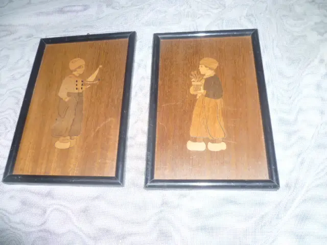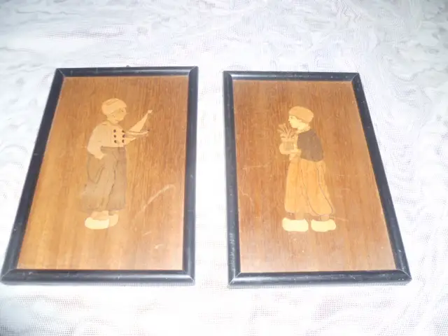 Paar Intarsien Bilder mit holländischen Kindern um 1900 verschiedene Edelhölzer , 1 Junge mit Segelschiff und 2 Junge mit Blumentopf
