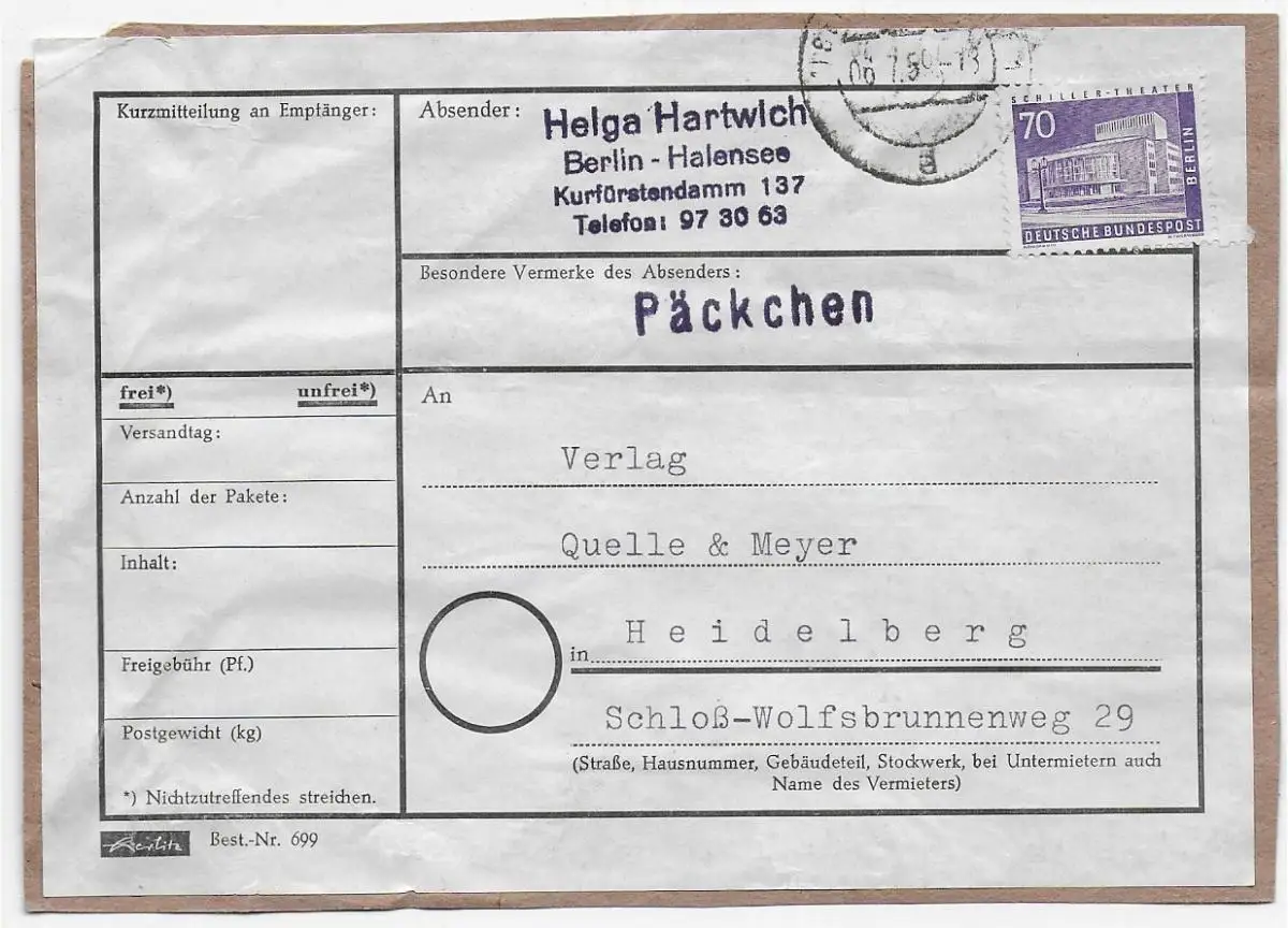 Päckchen Adressteil Berlin nach Heidelberg, MiNr. 152, EF