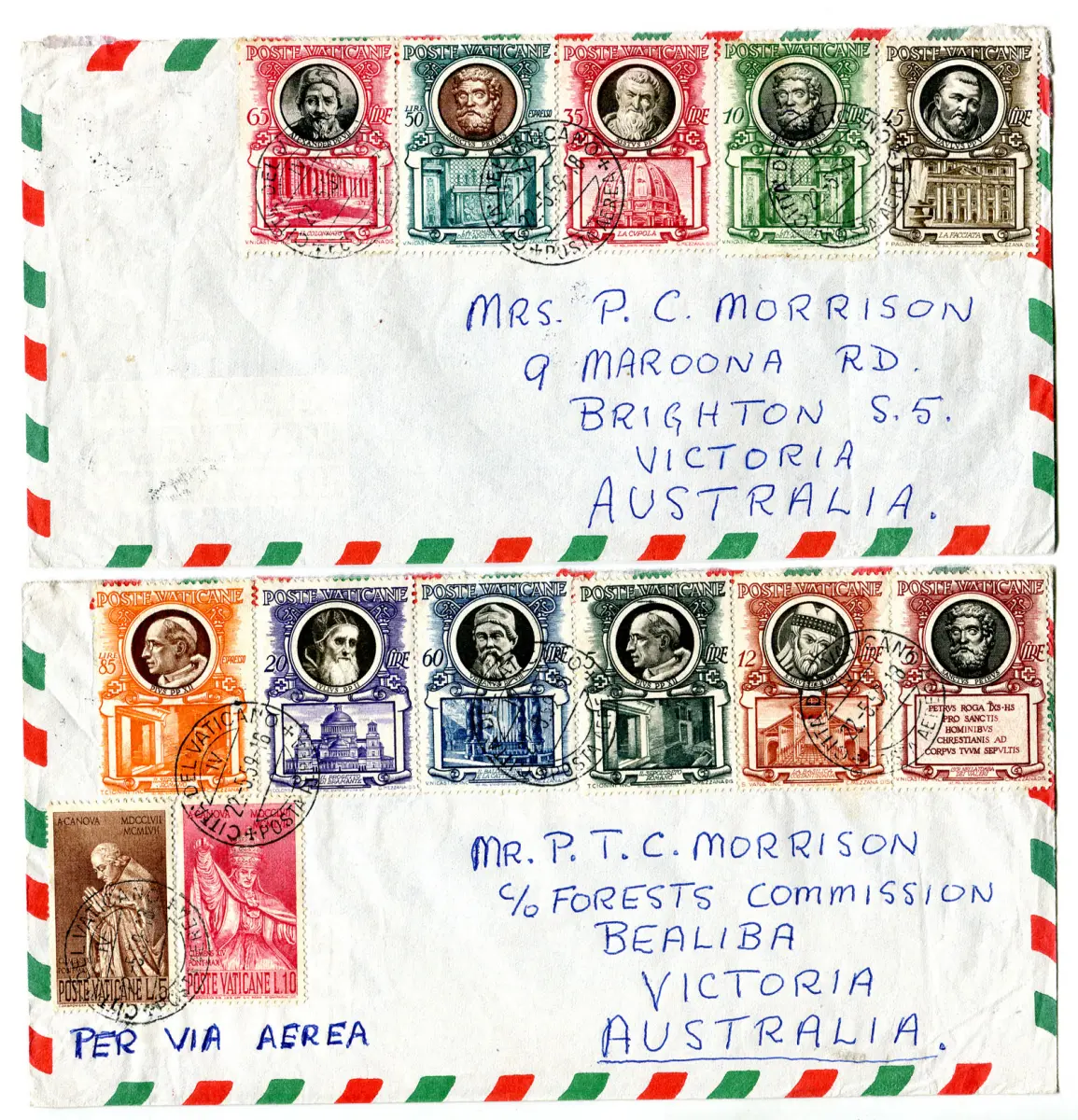 Päpste und Basiliken Nr. 158/168 + Espresso Nr. 13/14 - Zwei frankierte Luftumschläge nach Australien am 22.5.59 mit elf verschiedenen Werten der Serie - Uncommon Cod. 909/16