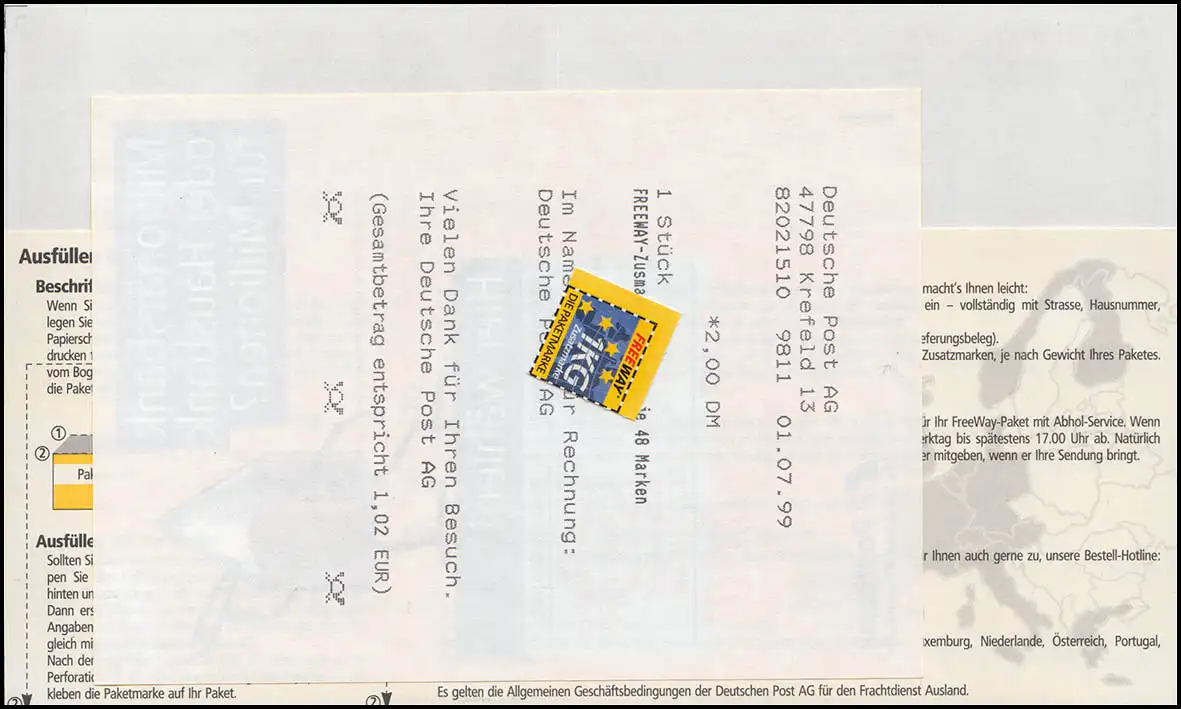 Blaue Freeway-Paketmarke mit Abhol-Service mit Ersttagsstempel KREFELD 1.7.99 + Ergänzungsmarke für ein weiteres Klogramm, mit EPOS-Ersttagsquittung