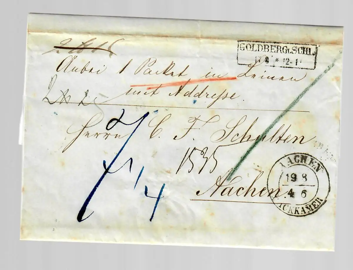 Paketbegleitbrief Goldberg/Schlesien nach Aachen 1854
