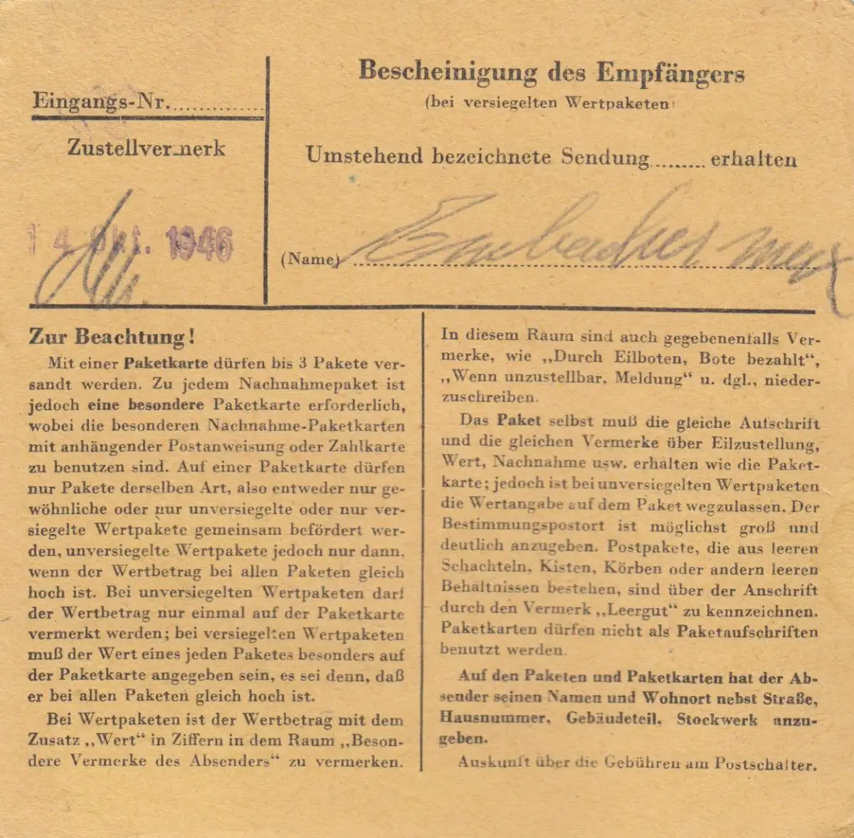 Paketkarte 1946: Heldenbergen nach Bad Aibling, Wertkarte