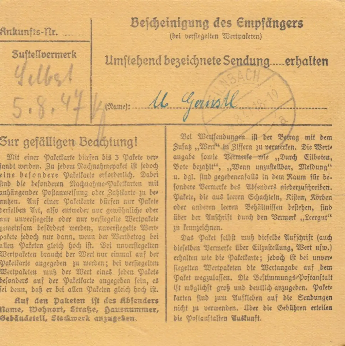 Paketkarte 1947: Bad Aibling, Handelsvertretung nach Feilnbach, Wertkarte