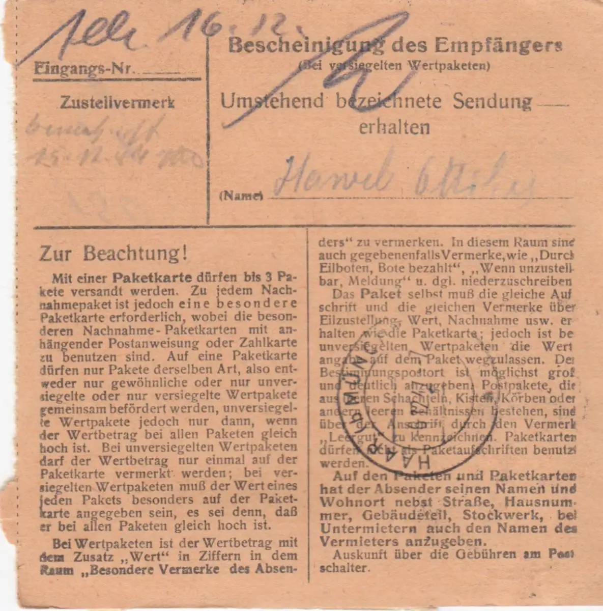 Paketkarte 1947: Burghaslach nach Haar b. München