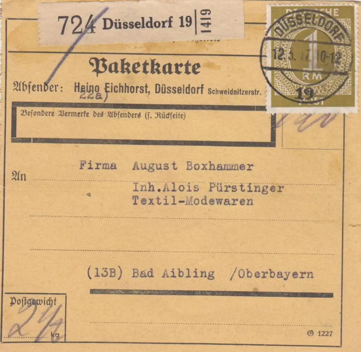 Paketkarte 1947: Düsseldorf nach Textilwaren in Bad Aibling, Selbstbucher
