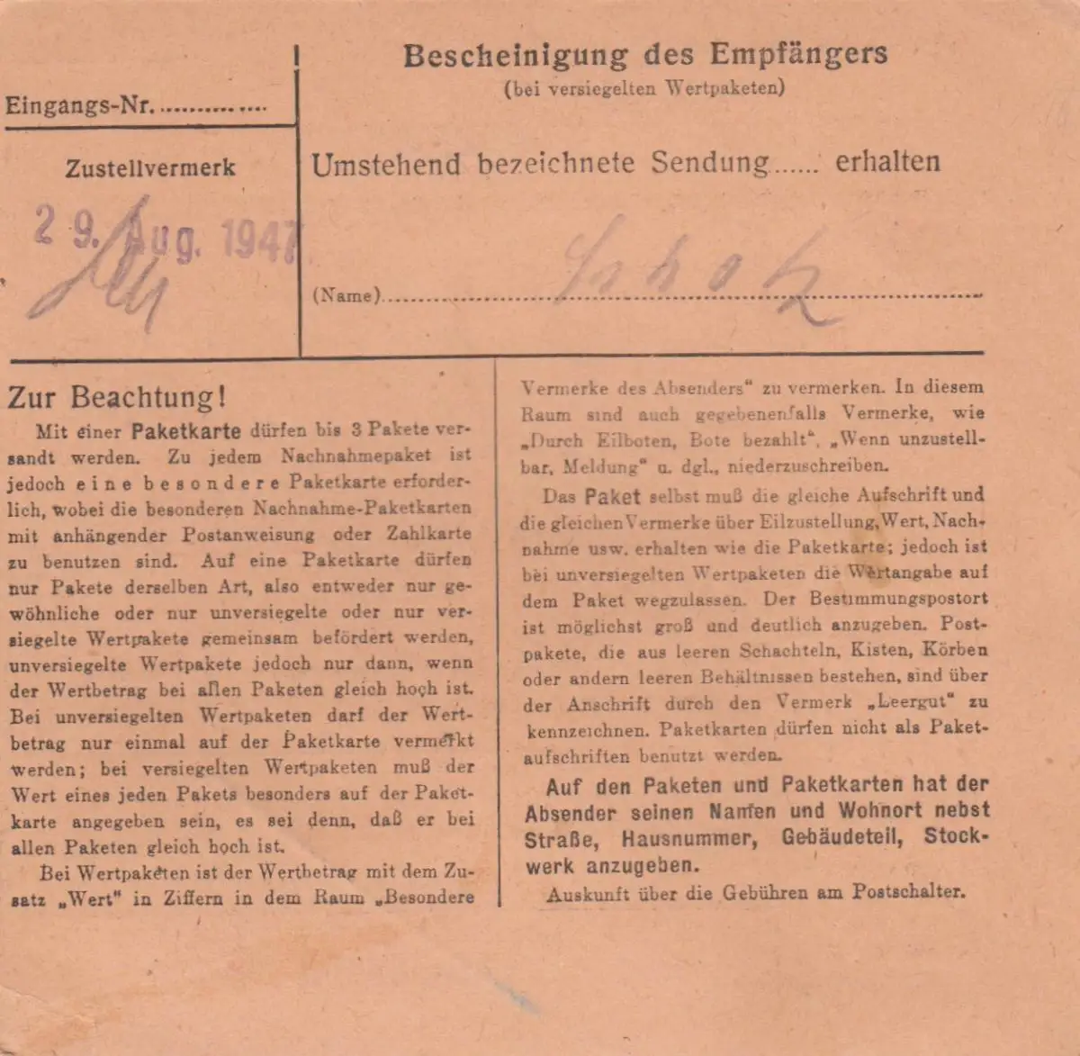 Paketkarte 1947: Ehekirchen nach Bad Aibling