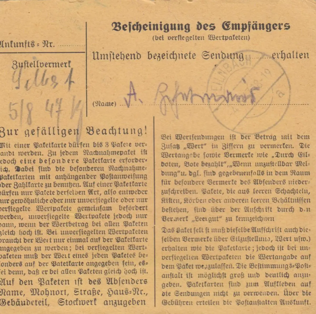 Paketkarte 1947: Mannheim nach Kronwitt, Post Feilnbach, Selbstbucher