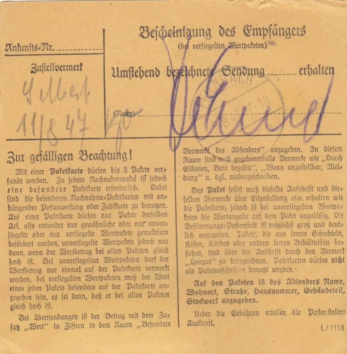 Paketkarte 1947: München 50 nach Feilnbach, Selbstbucher