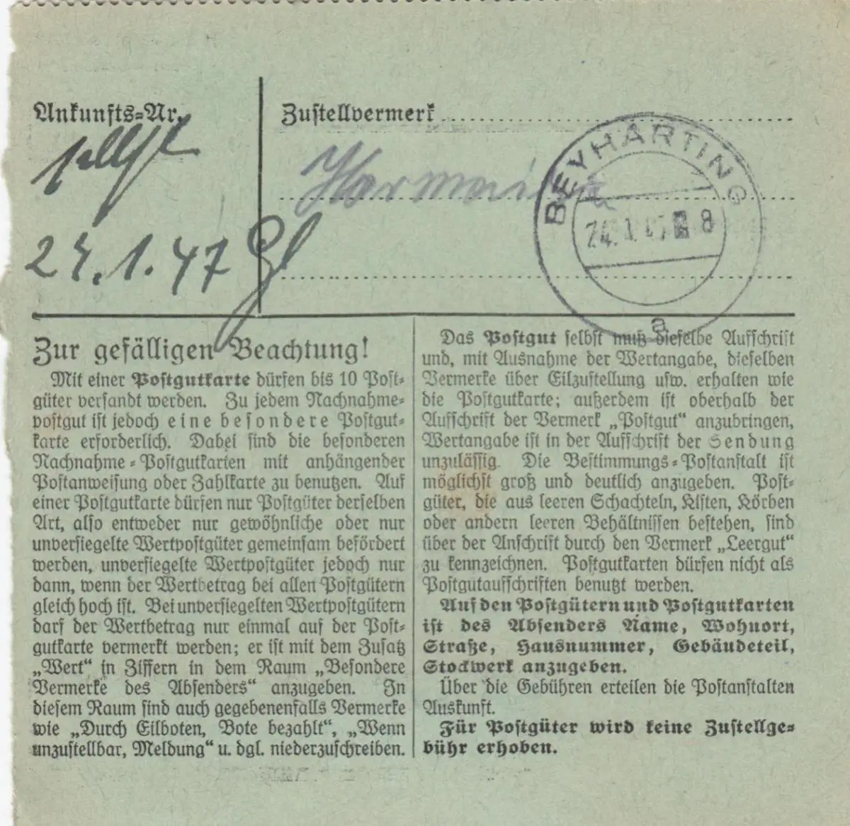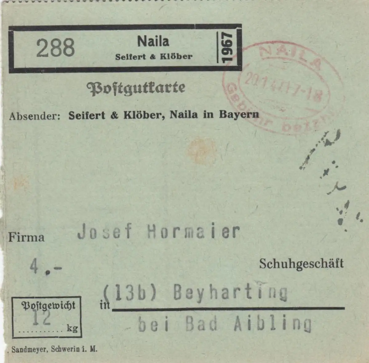 Paketkarte 1947: Naila n. Beyharting, Gebühr bezahlt Stempel, seltenes Formular