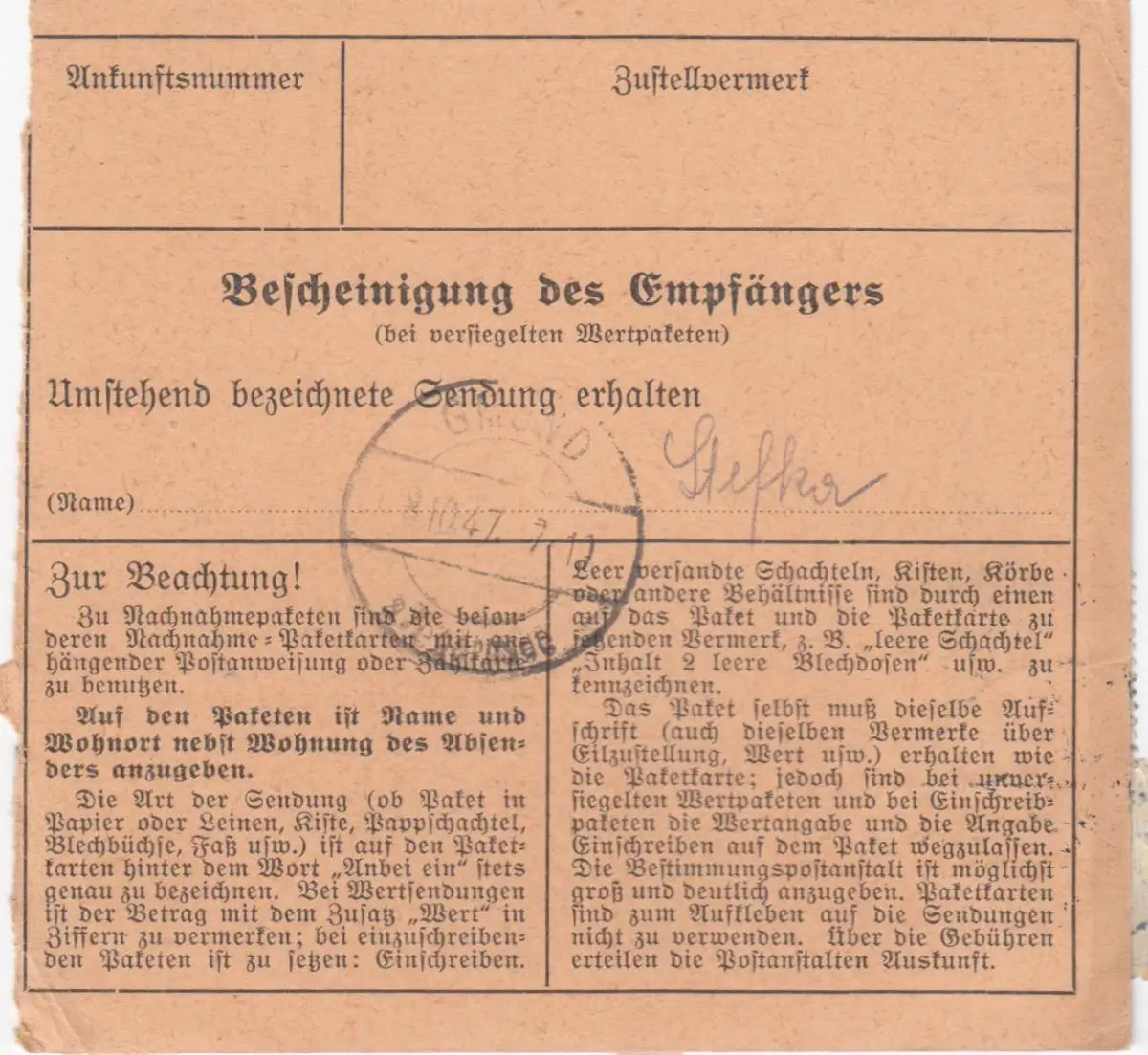 Paketkarte 1947: Nürnberg nach Moosrain, Selbstbucher, Wertkarte