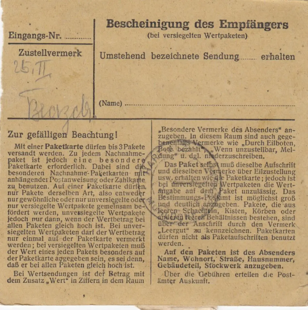 Paketkarte 1948: Aalen nach Hart a.d. Alz