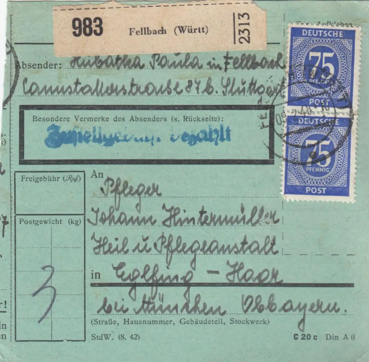 Paketkarte 1948: Fellbach nach Eglfing-Haar, Anstalt, besonderes Formular