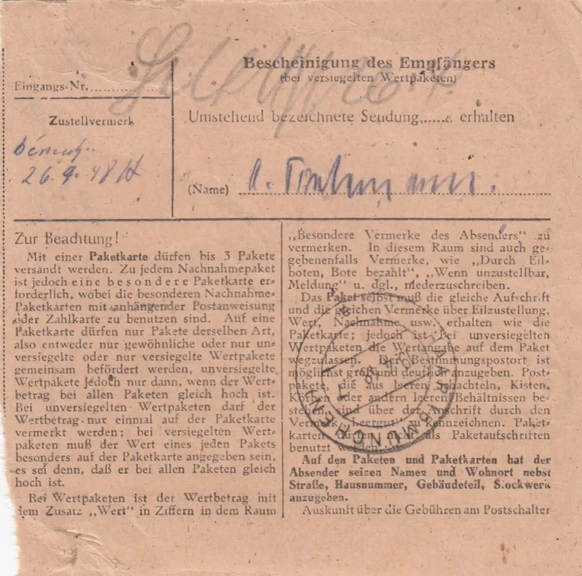 Paketkarte 1948: Glückstadt Selbstbucher -Lushorn- nach Haar bei München