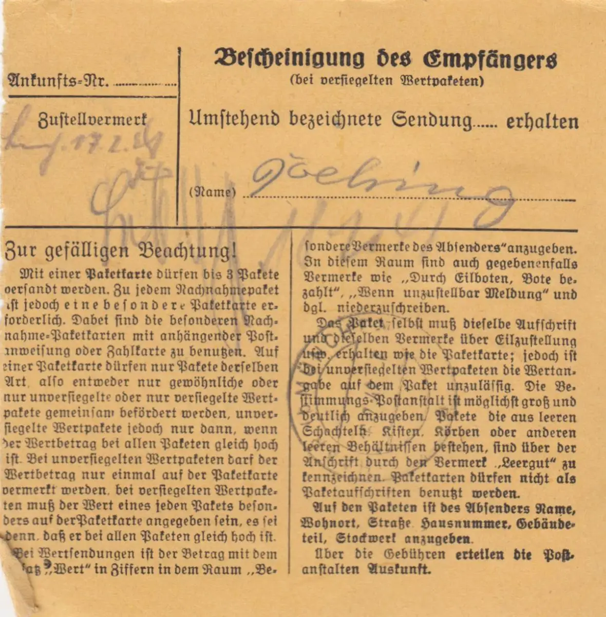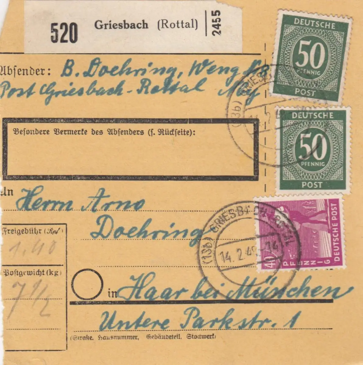 Paketkarte 1948: Griesbach Rottal nach Haar