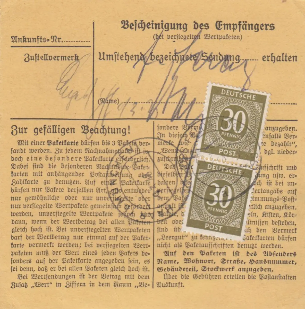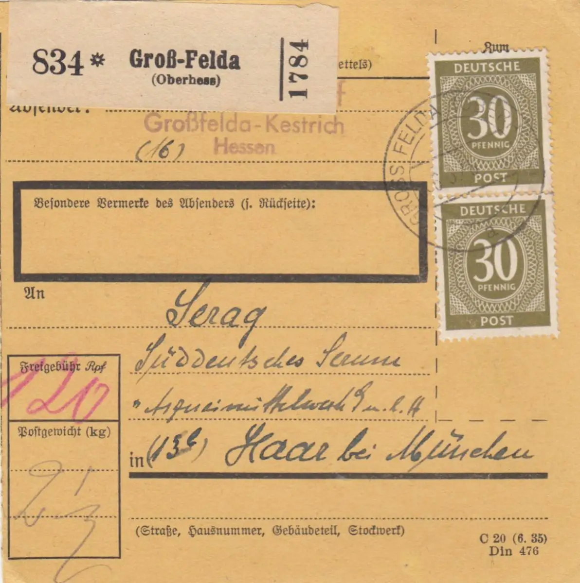 Paketkarte 1948: Großfelda Kestrich nach Haar