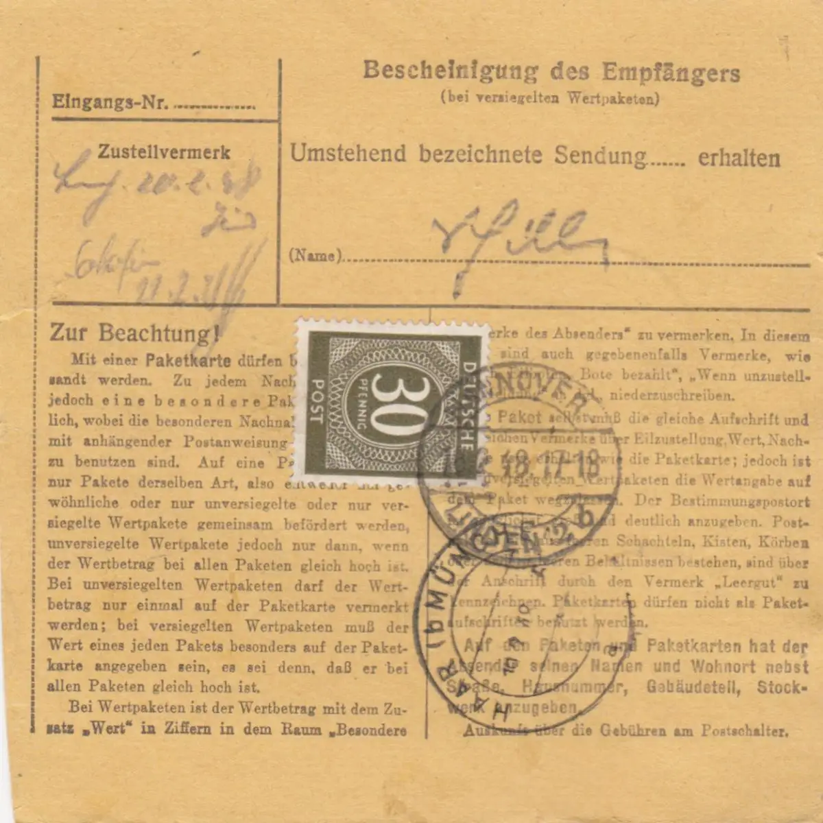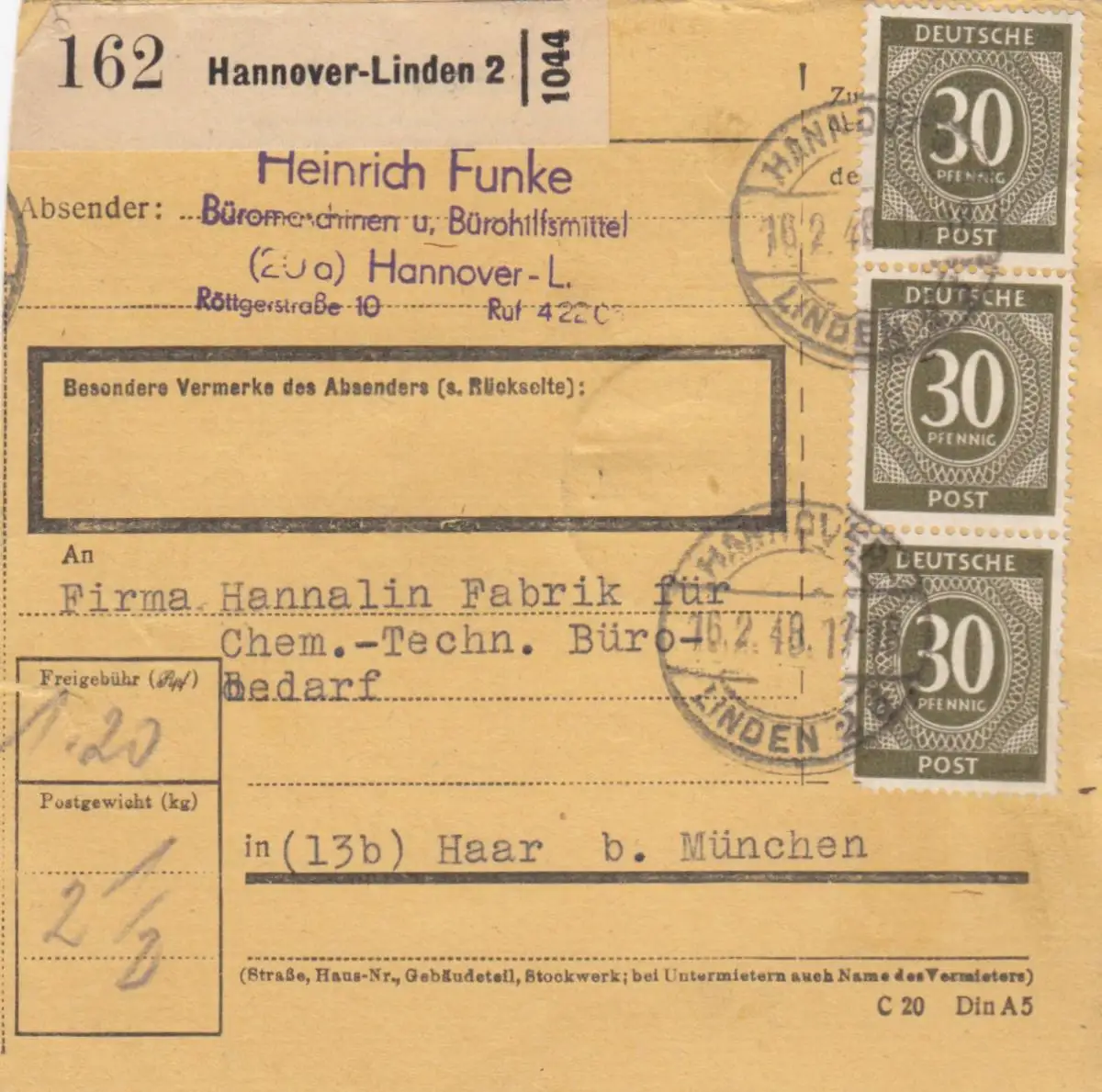 Paketkarte 1948: Hannover-Linden nach Chem.-Techn. Büro in Haar