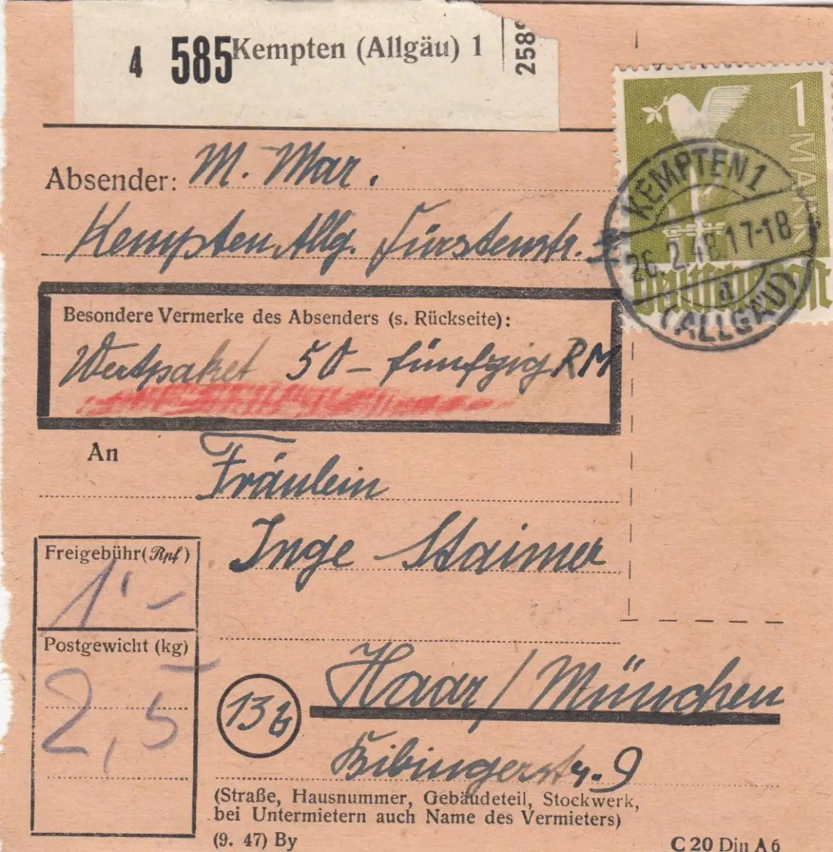 Paketkarte 1948: Kempten nach Haar, Wertkarte