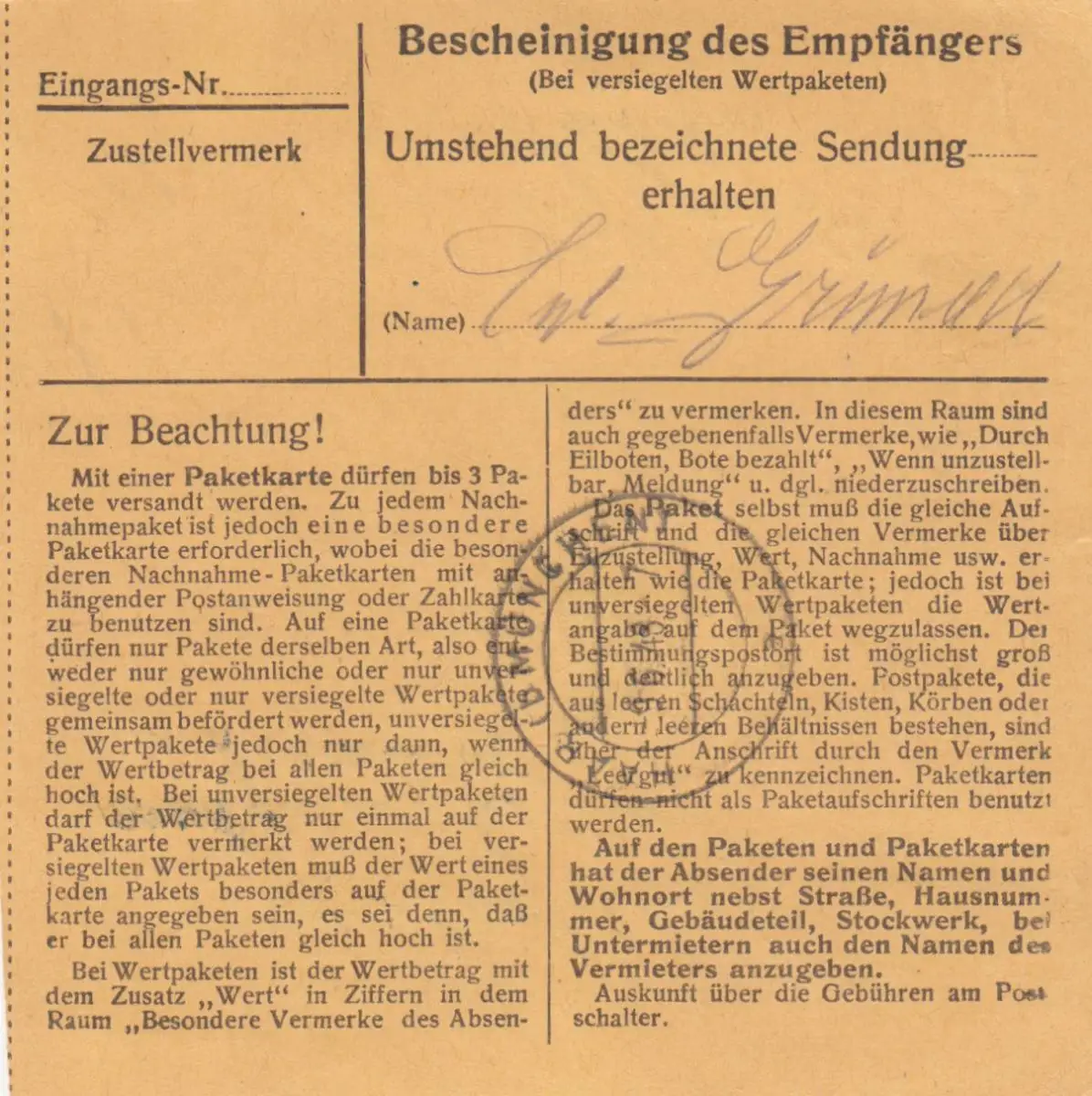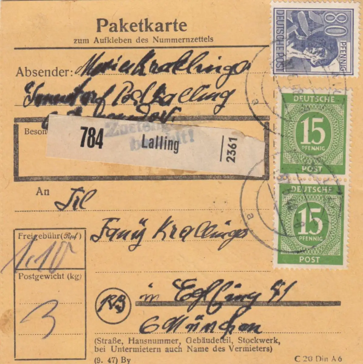 Paketkarte 1948: Lalling nach Eglfing b. München