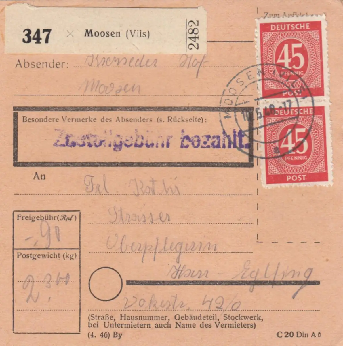 Paketkarte 1948: Moosen Vils nach Haar, Oberpflegerin