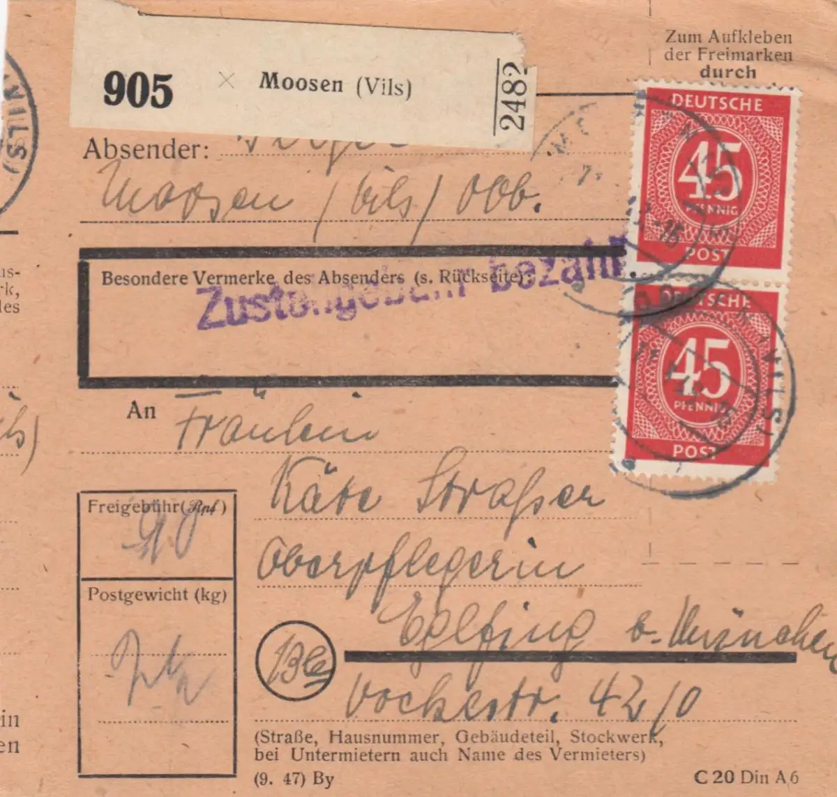 Paketkarte 1948: Moosen nach Oberpflegerin in Eglfing