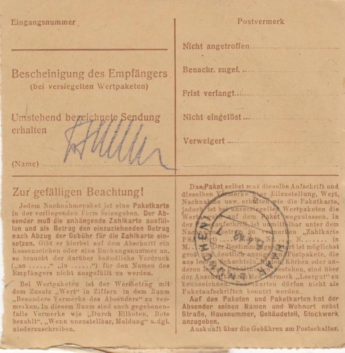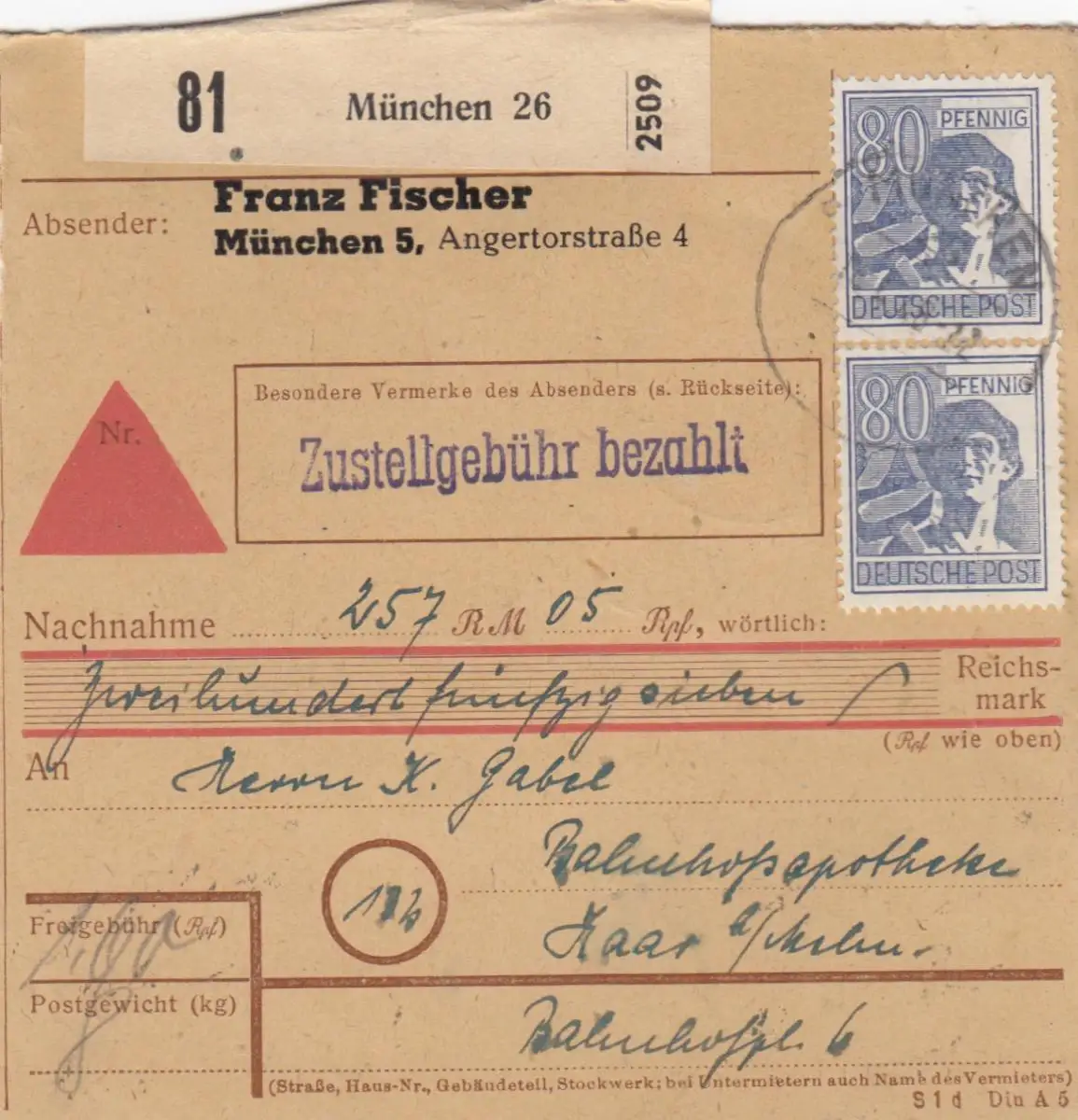 Paketkarte 1948: München nach Haar, Selbstbucher, Nachnahme