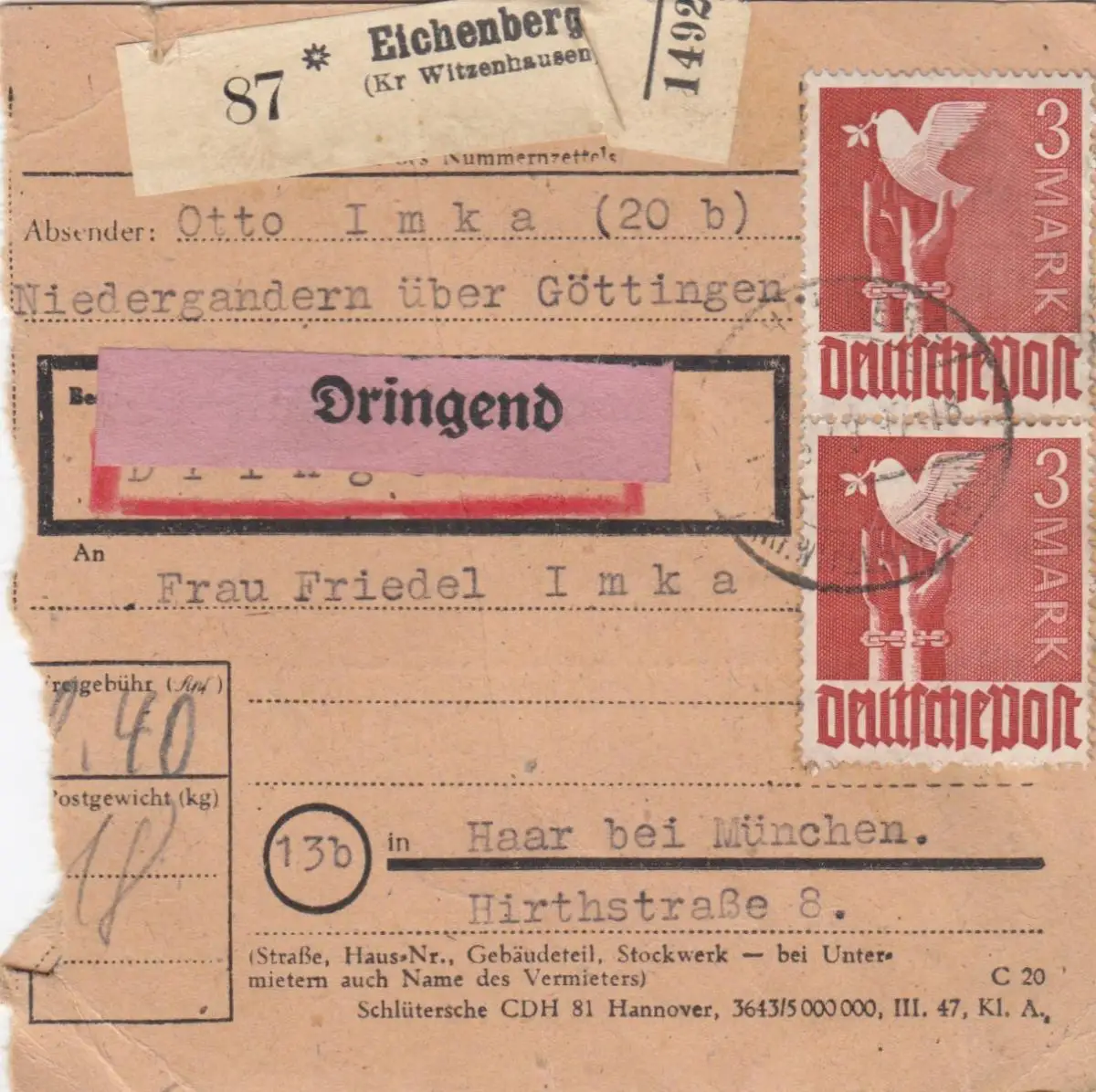 Paketkarte 1948: Niedergandern über Göttingen nach Haar, Dringend